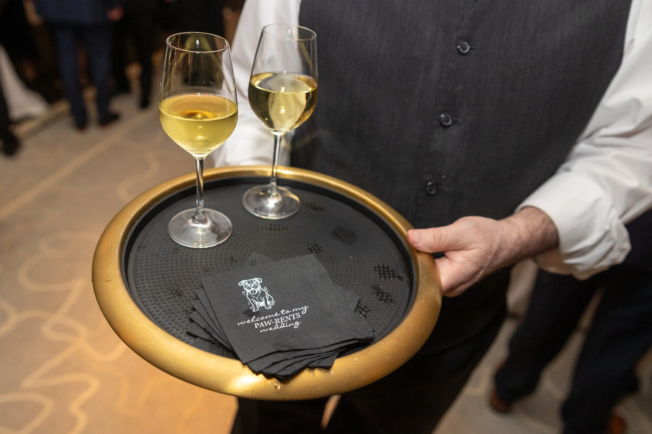 If your dog isn’t exactly the “let’s party with room full of people” type, you can still feature them in meaningful and adorable ways. Consider a tribute: drawings of them on your napkins, custom cocktail stir sticks, a dance-floor cutout, printed socks, or even a veil embroidered with their sweet face. It’s a perfect way to include them without overwhelming them and guests will absolutely love it.